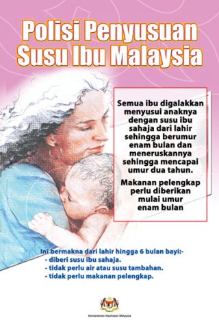 “Semua ibu digalakkan menyusukan anaknya dengan susu ibu SAHAJA dari lahir sehingga umur 6 bulan dan meneruskannya sehingga anaknya berumur 2 tahun. Makanan tambahan perlu dimulakan semasa anak berumur 6 bulan.
